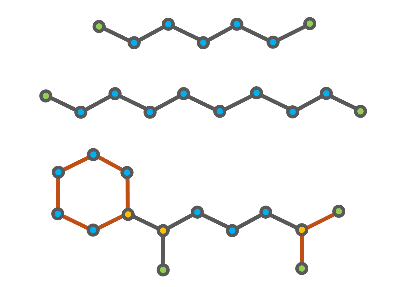 Fig. 4 Chemical structures of heptane (top), decane (middle), and (1,5-dimethylhexyl)cyclohexane (bottom). The CH3 groups are highlighted in green, the CH2 groups in blue, and the CH group in gold. The additional second order structures of (1,5-dimethylhexyl)cyclohexane are shown in orange.