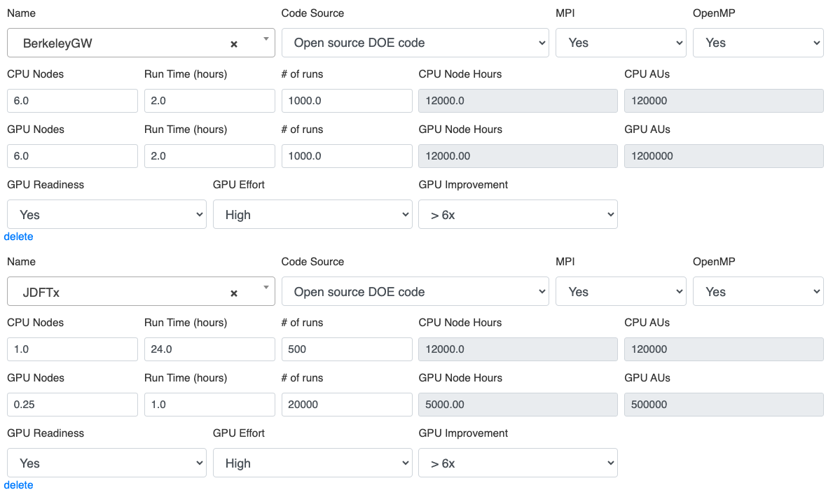 To calculate the AU request for the allocation, input the software that you will be using and information about the runs that will be using that software. You should add an entry for each major application that you will be running. Fractional node values are allowed and can be used if your runs don't require a full node's resources. You can assign GPU and/or CPU hours to a software record. The total AU calculation for all of the software entries is used to automatically populate the resource request for the allocation. Please see the image below for an example computational request.