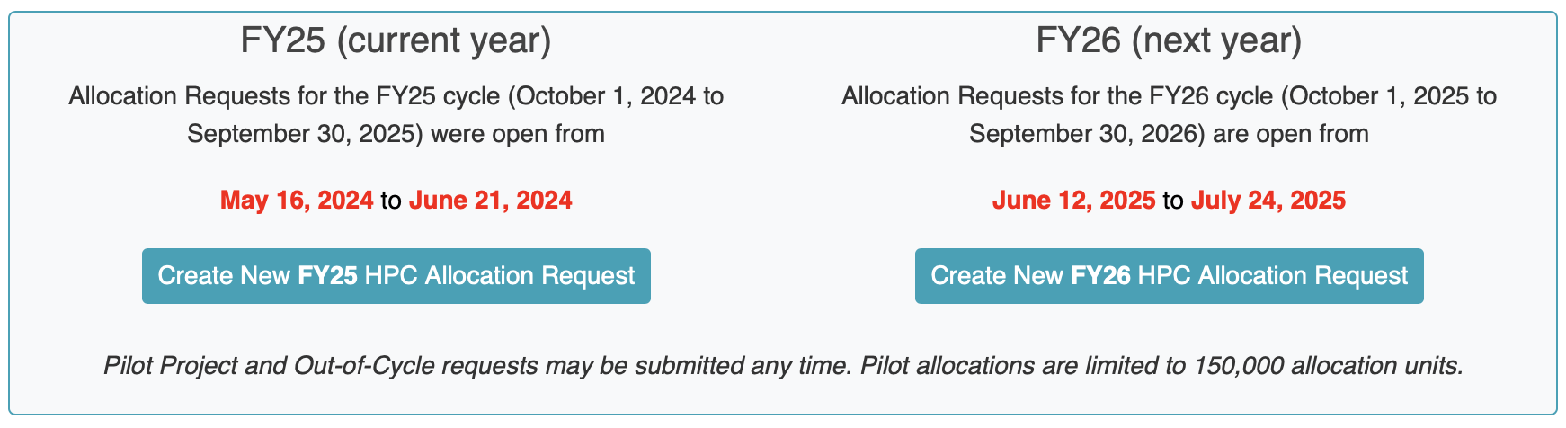 Once logged in, the request form buttons will be on the home page. To request an allocation for an out-of-cycle/pilot allocation for use in the current fiscal year, click the current year's button. When the allocation cycle is open, a button will be available for the next fiscal year.