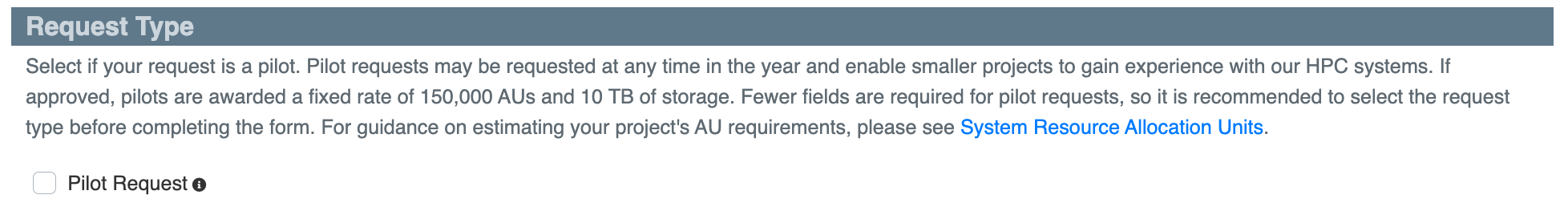 If your request is for 150,000 AUs or less, check the Pilot Request option. Fewer fields are required for pilot requests, so be sure to select this option before filling out the rest of the form. If approved, pilots are granted 150,000 AUs on Kestrel and 10TB of /projects storage by default. Pilot projects can be granted at anytime throughout the year.