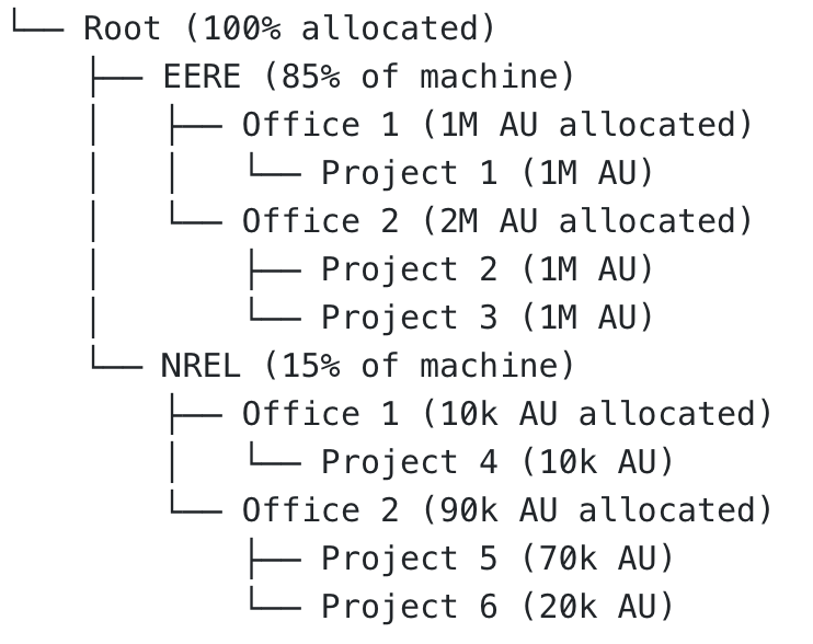In this hypothetical scenario, fairshare values would be calculated at each point in the fairtree. The fairshare calculations are a function of: (1) the allocation, (2) the sum of the sibling allocations, and (3) recent usage of both the allocation and the siblings. For example, the utilization and allocations of all projects in EERE / Office 2 would be used to calculate the individual level fairshare value for the individual projects contained in that office. Similarly, the fairshare values for all offices within EERE would be used to calculate the fairshare values for EERE / Office 1 and EERE / Office 2.