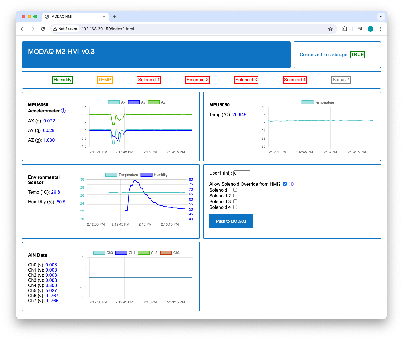 A Human-Machine Interface, or HMI, is a control panel or portal that enables high-speed, near realtime interaction with M2. It can display or plot values and allow for operator control of specifically coded elements running in M2- such as manual control of a relay.